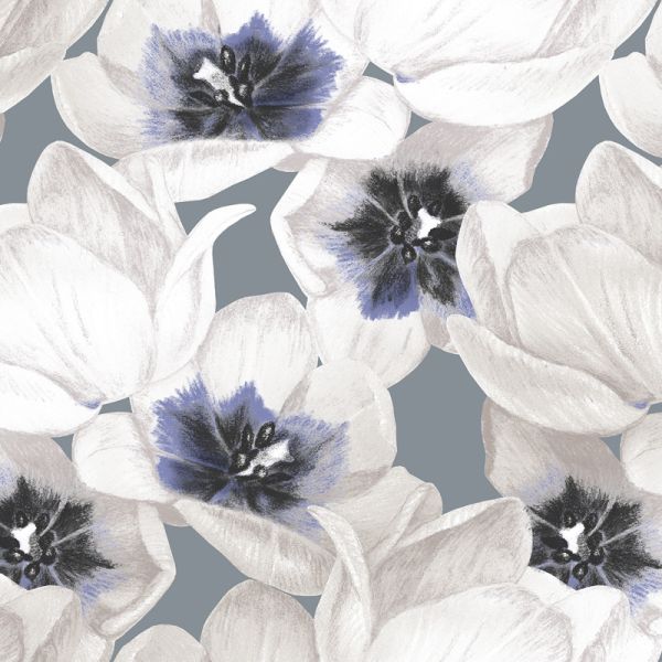 Tämä kaunis tapetti yhdistää suurikokoiset, pehmeän valkoiset kukat ja viileän siniharmaan taustan elegantiksi kokonaisuudeksi. Kukkien tummansiniset yksityiskohdat tuovat syvyyttä ja hienostuneisuutta, luoden tilaan rauhallisen mutta vaikuttavan tunnelman. Täydellinen valinta, kun haluat tuoda kotiisi luonnon kauneutta ja modernia tyylikkyyttä samassa paketissa.