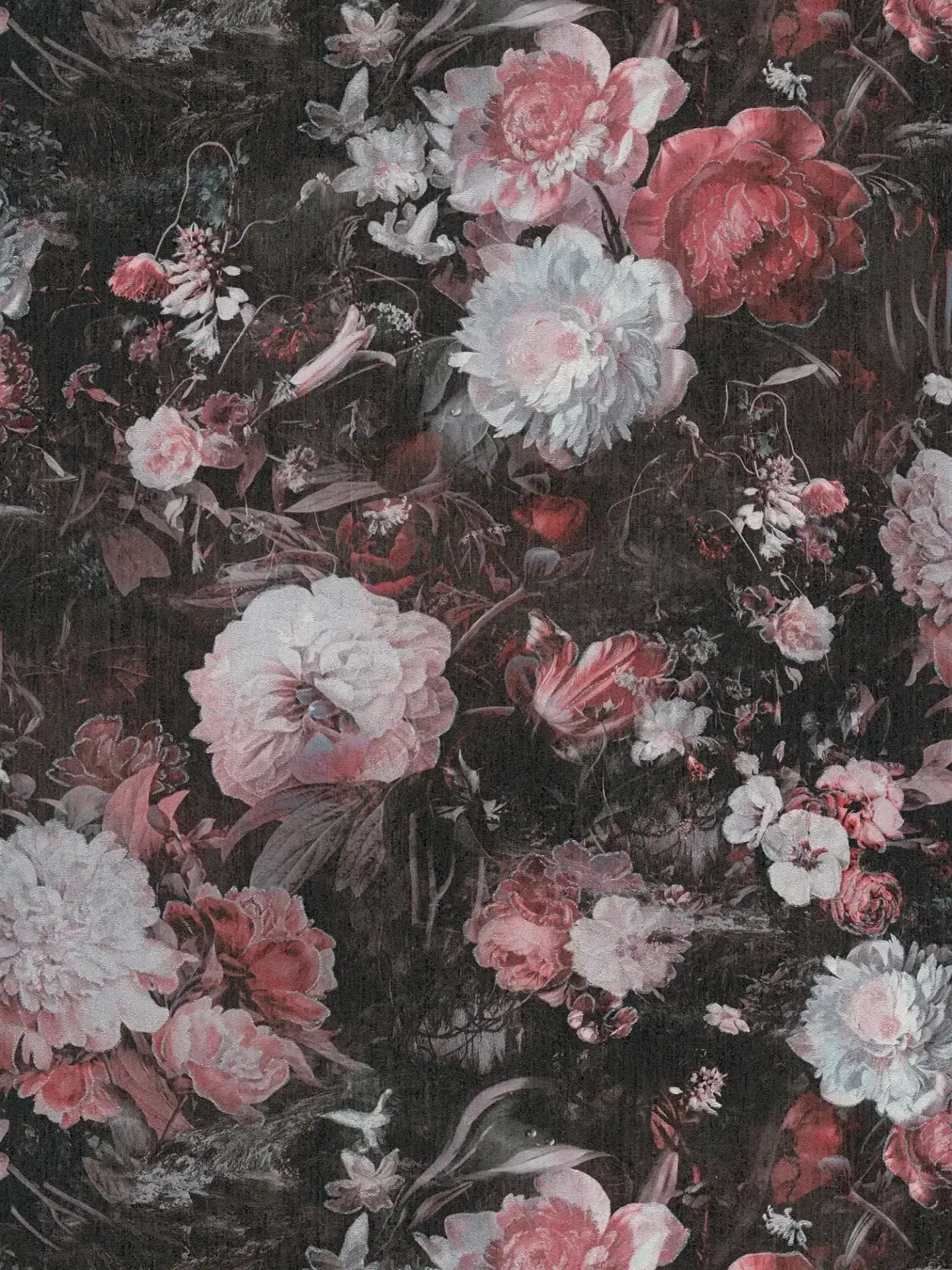 Se luo huoneeseen ylellisen, hieman salaperäisen tunnelman, joka toimii yhtä hyvin makuuhuoneessa kuin olohuoneessakin. Jokainen yksityiskohta on tarkkaan viimeistelty: terälehdet toistuvat kuin valokuvassa, ja sävyt liukuvat harmonisesti tummasta vaaleaan. Tapetti on täydellinen valinta, kun haluat tilaan ripauksen eleganssia, nostalgiaa ja rohkeaa persoonallisuutta.