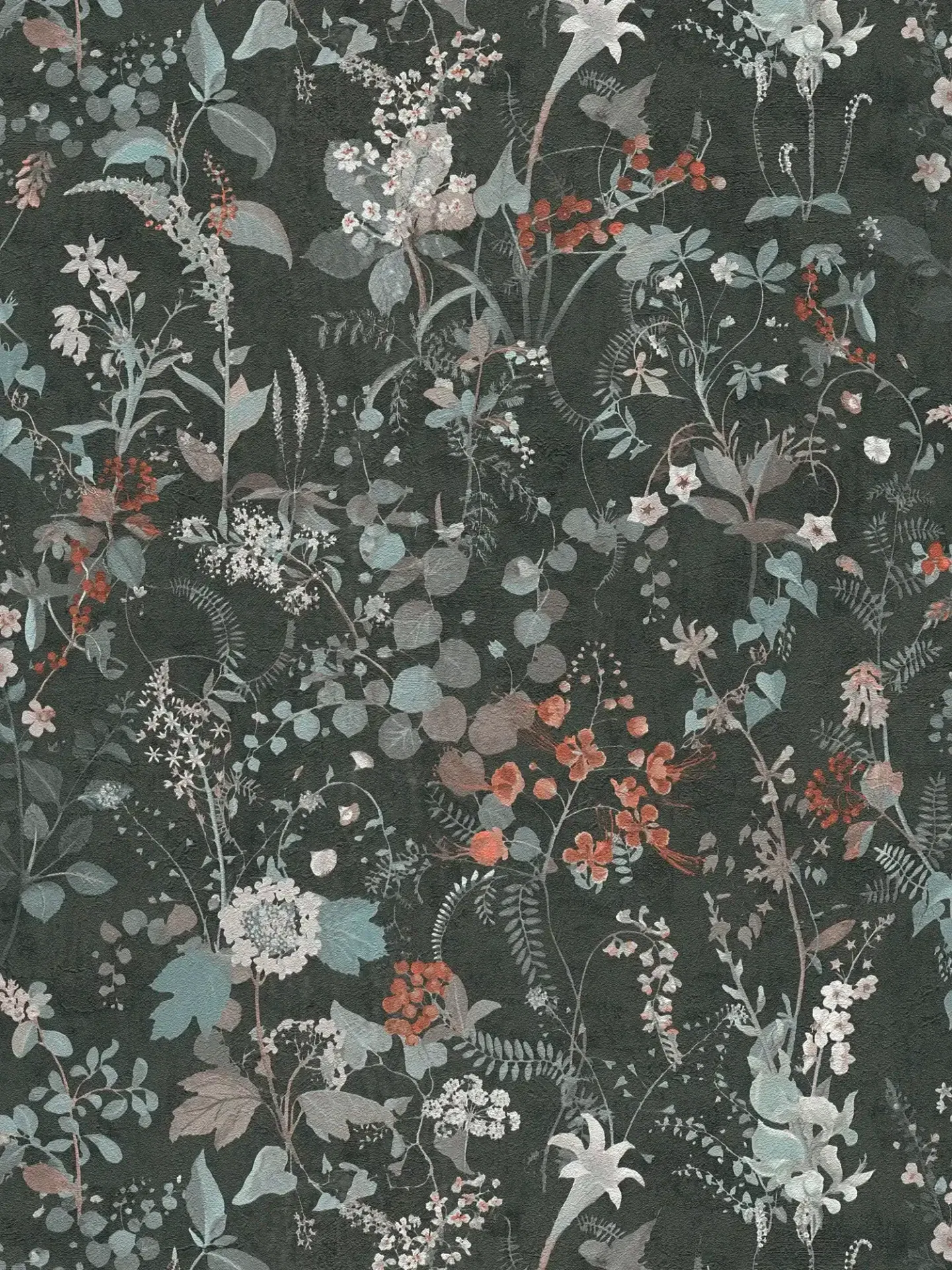 Tämä tapetti tuo seinälle tumman, metsänsyvyisen pohjan, jonka päällä kukat ja lehdet heräävät eloon hienostuneissa, murretuissa sävyissä. Punertavat kukat, pehmeät vihreät ja utuisten harmaat lehvistöt luovat yhdessä tunnelman, joka on yhtä aikaa mystinen ja rauhoittava – kuin iltahämärässä kylpevä puutarha.